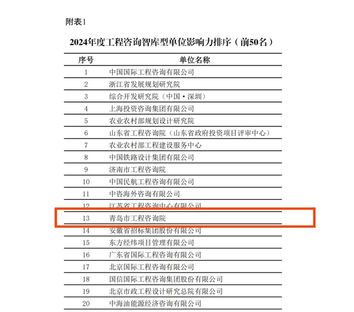 近年来,我院着力打造经济社会高端智库,成效显著,已形成以工程咨询为“根基”、产业研究为“花朵”、数智能力为“营养”的“三位一体”智库链条。目前,我院50余人入选国家及省市级权威专家库,咨询成果累计获全国优秀工程咨询成果奖20余项,山东省优秀咨询成果奖20余项,多篇论文获《中国工程咨询》杂志优秀论文奖,并牵头建立青岛市产业研究圆桌会议机制,有效服务政府决策与产业发展。(完)