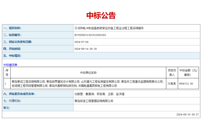 近日,由青岛青咨工程咨询有限公司、青岛市勘察测绘研究院等七家单位组成的联合体顺利中标汉河热电1#机组高参数背压改造工程全过程工程咨询服务。服务内容主要包括可行性研究报告编制、工程设计、环境影响分析与评价、既有厂房检测鉴定、既有厂房加固设计、勘察测绘、节能咨询、安全评价、职业病危害评价、水土保持、环境监测与检测、环保验收、招标代理、工程造价、工程监理、项目管理、统筹协调等。